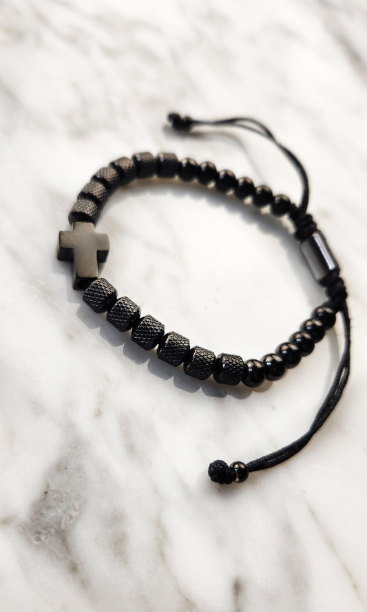 Rope Bracelet - Unisex Stainless Black Onyx with Cross Pendant