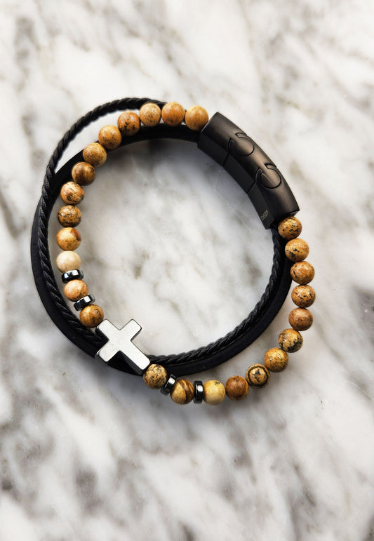 Leather Bangle - Stainless Steel Men’s Triple-strap with Bead Bracelet and Cross