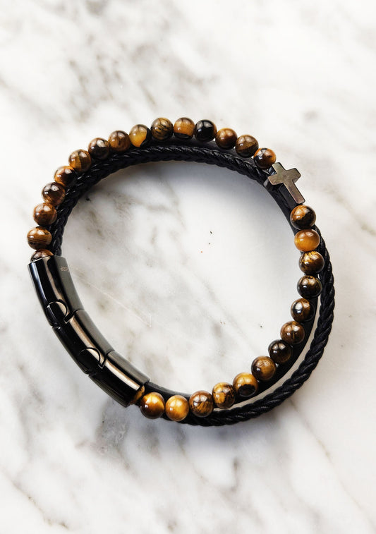 Leather Bangle - Yellow Tiger Eye Bead and Multi-strap with Shiny Black Cross