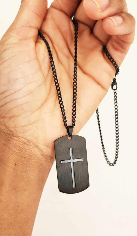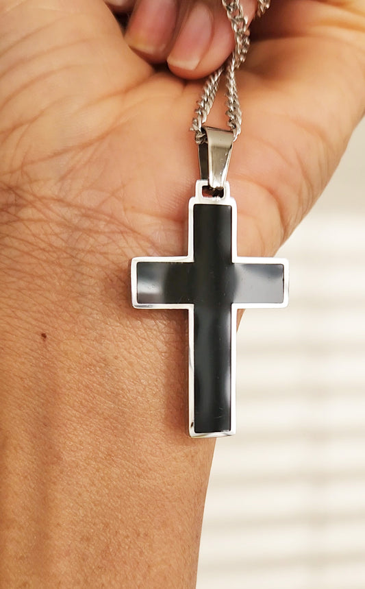 Stainless Steel Necklace - Matte and Shiny Black Cross Pendant