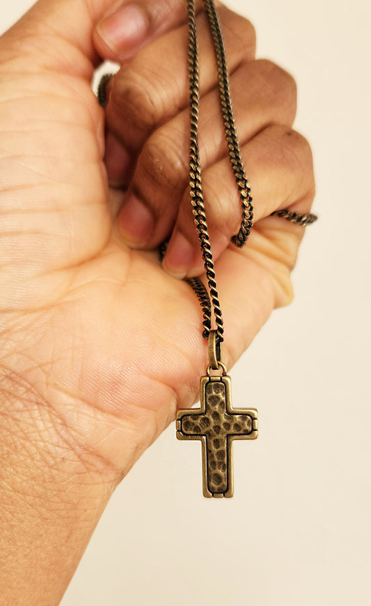 Stainless Steel Necklace with Hammered Cross Pendant in Bronze